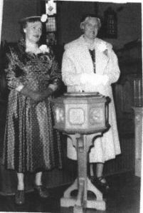 ~ 1955 – Baptismal font (pictured on right) was received in May of this year. Given by sisters, Mrs. Ken Caverly and Mrs. J. A. Cole, in memory of their father, Cephas W. Souch – who loved this church. Ten children were baptized that day!